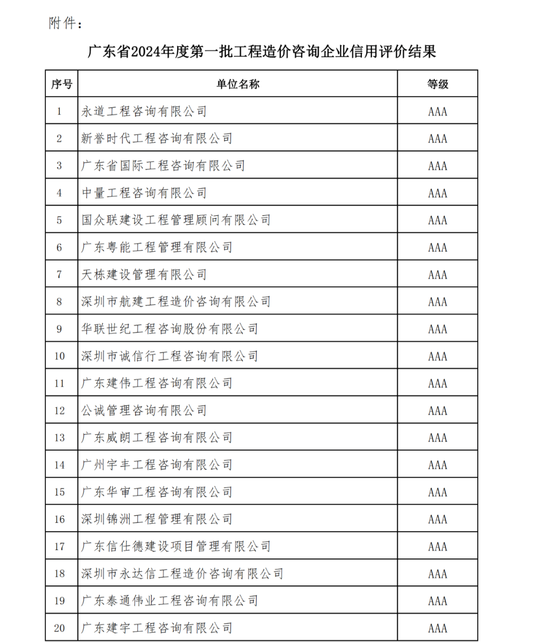 關(guān)于公布廣東省2024年度第一批工程造價咨詢企業(yè)信用評價結(jié)果的通知